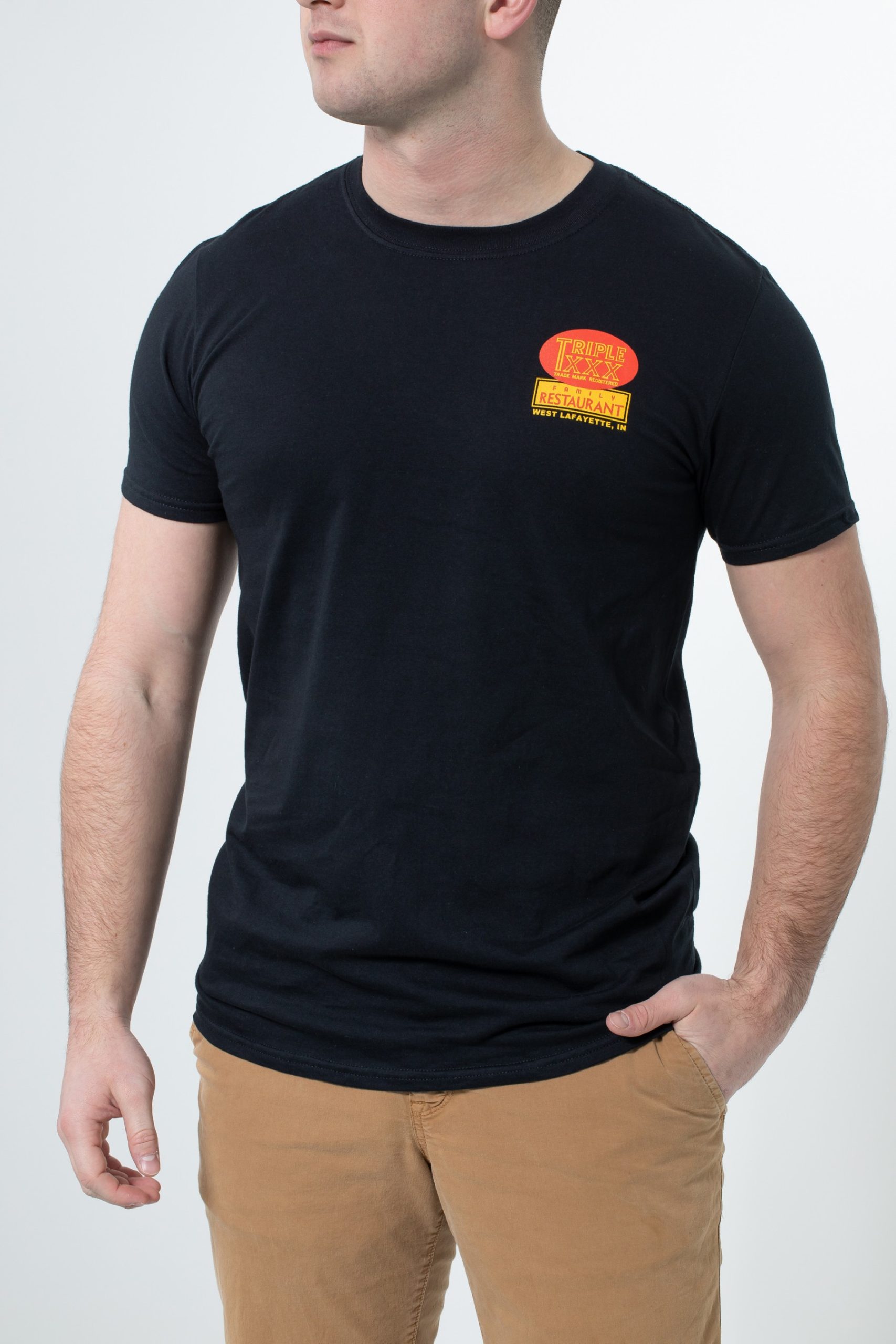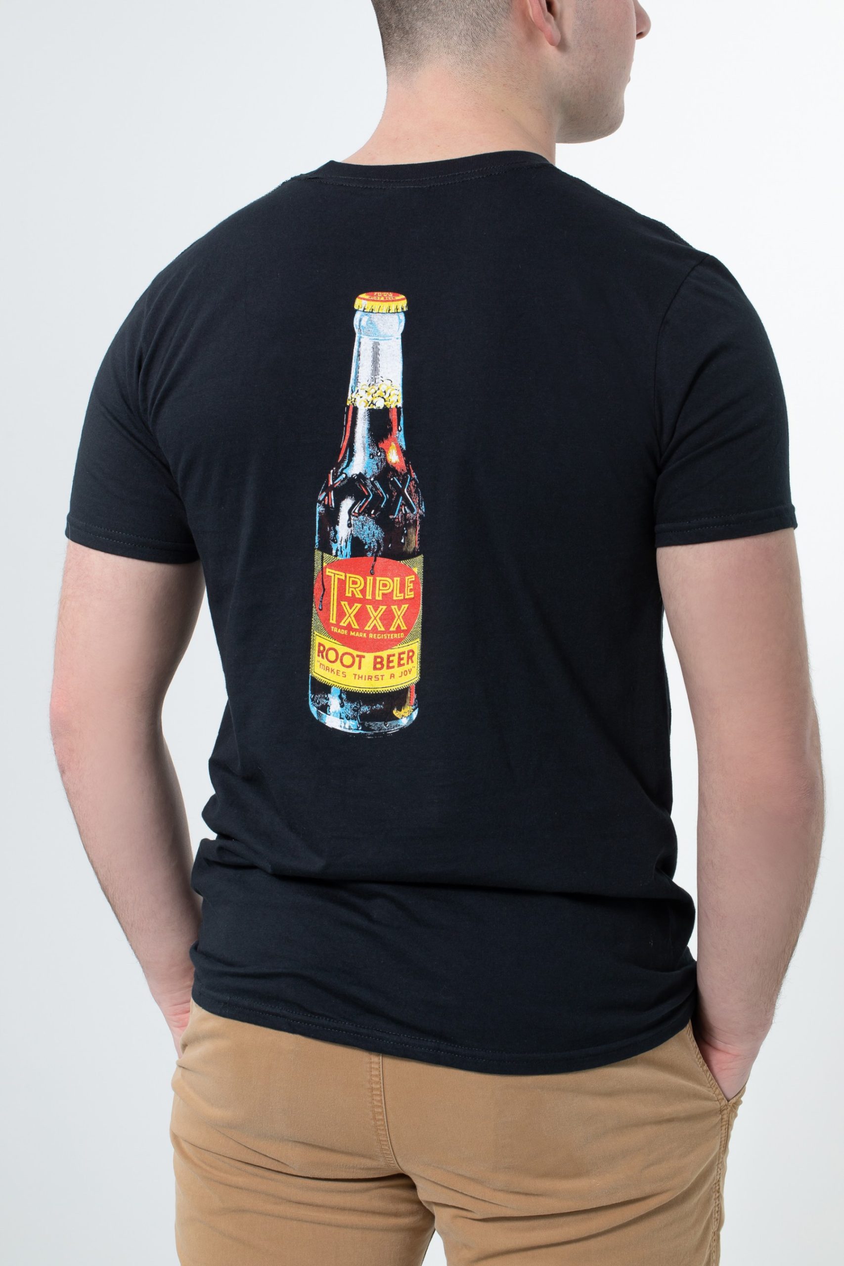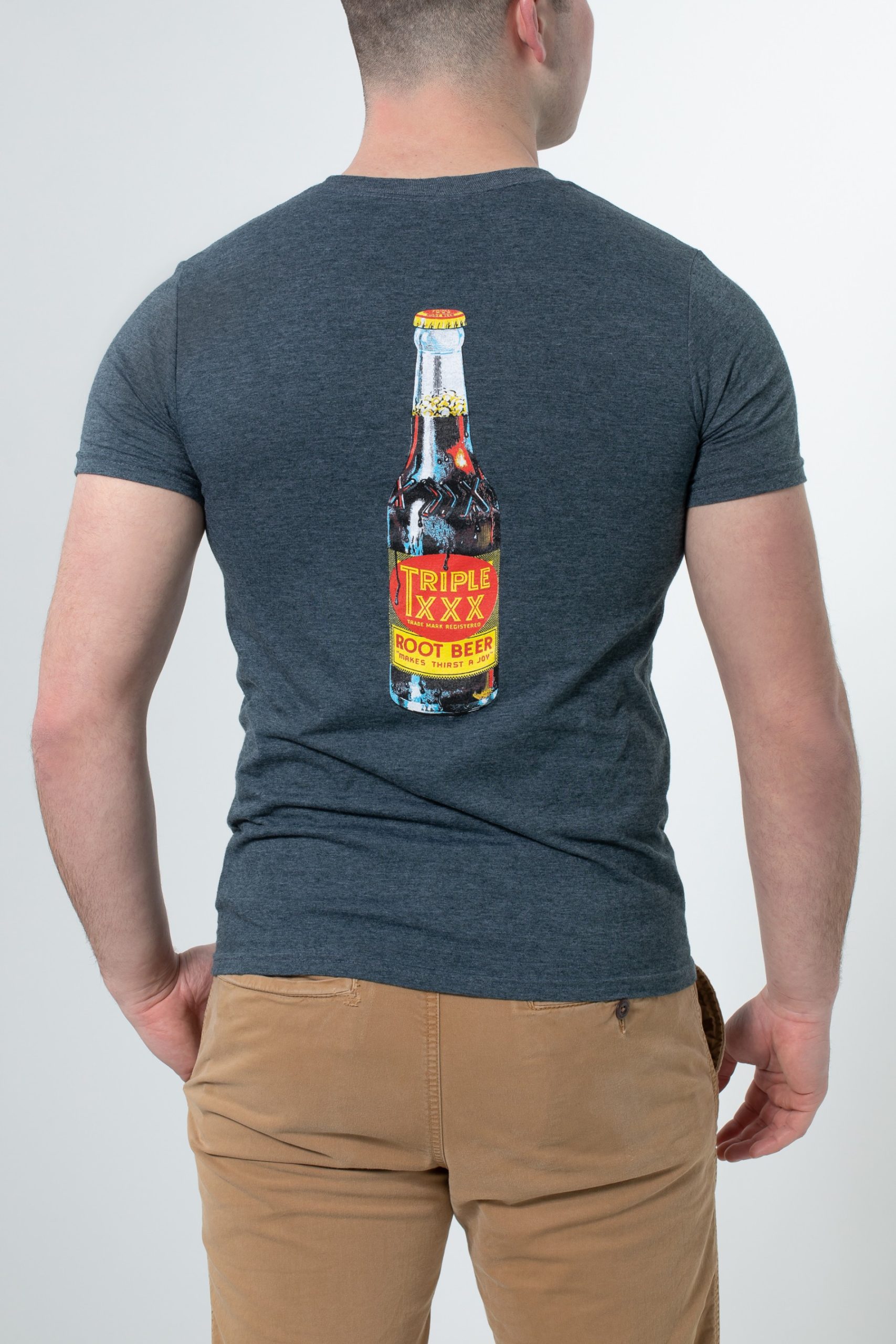 The iconic Triple XXX Root Beer Bottle as a work of art! Solid colors made of 100% Cotton. Heather colors made of Cotton/Poly Blend. All SoftStyle-Quality made- comfort style.